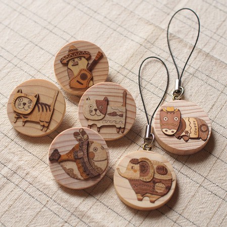 そのほかにも、可愛らしい動物たちの木はり絵ストラップやブローチといった雑貨も販売します。どうぞ新しい木の魅力を感じてください。